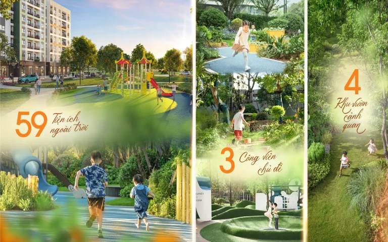 - Tiện ích vận động: Sân thể thao ngoài trời (cầu lông, bóng rổ, bóng chuyền), sân chơi trẻ em đa chủ đề, đường dạo bộ.