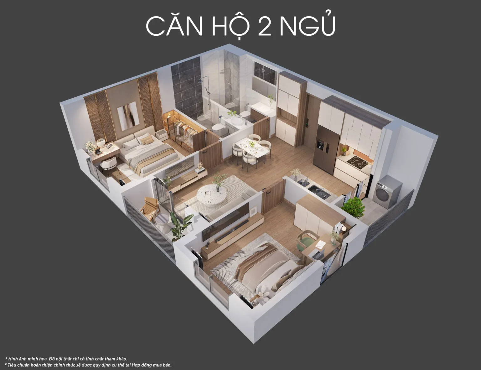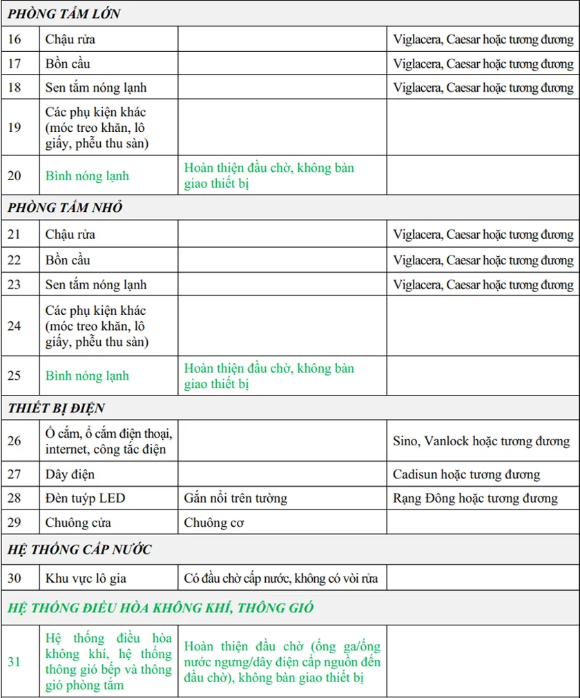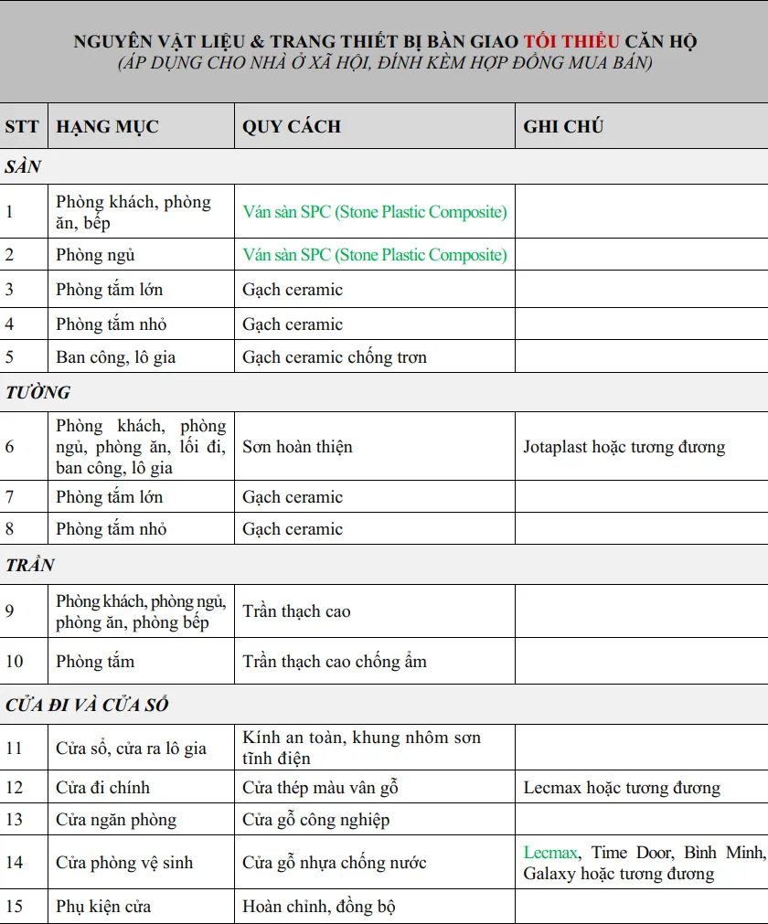 Lưu ý : Để tối ưu hóa giá bán theo khung quy định của Nhà nước và giúp các gia đình tự do thể hiện gu thẩm mỹ cá nhân, tiêu chuẩn bàn giao này KHÔNG BAO GỒM NỘI THẤT RỜI (không có hệ tủ bếp, tủ quần áo, giường, bàn ghế hay các thiết bị điện tử/điện lạnh).
