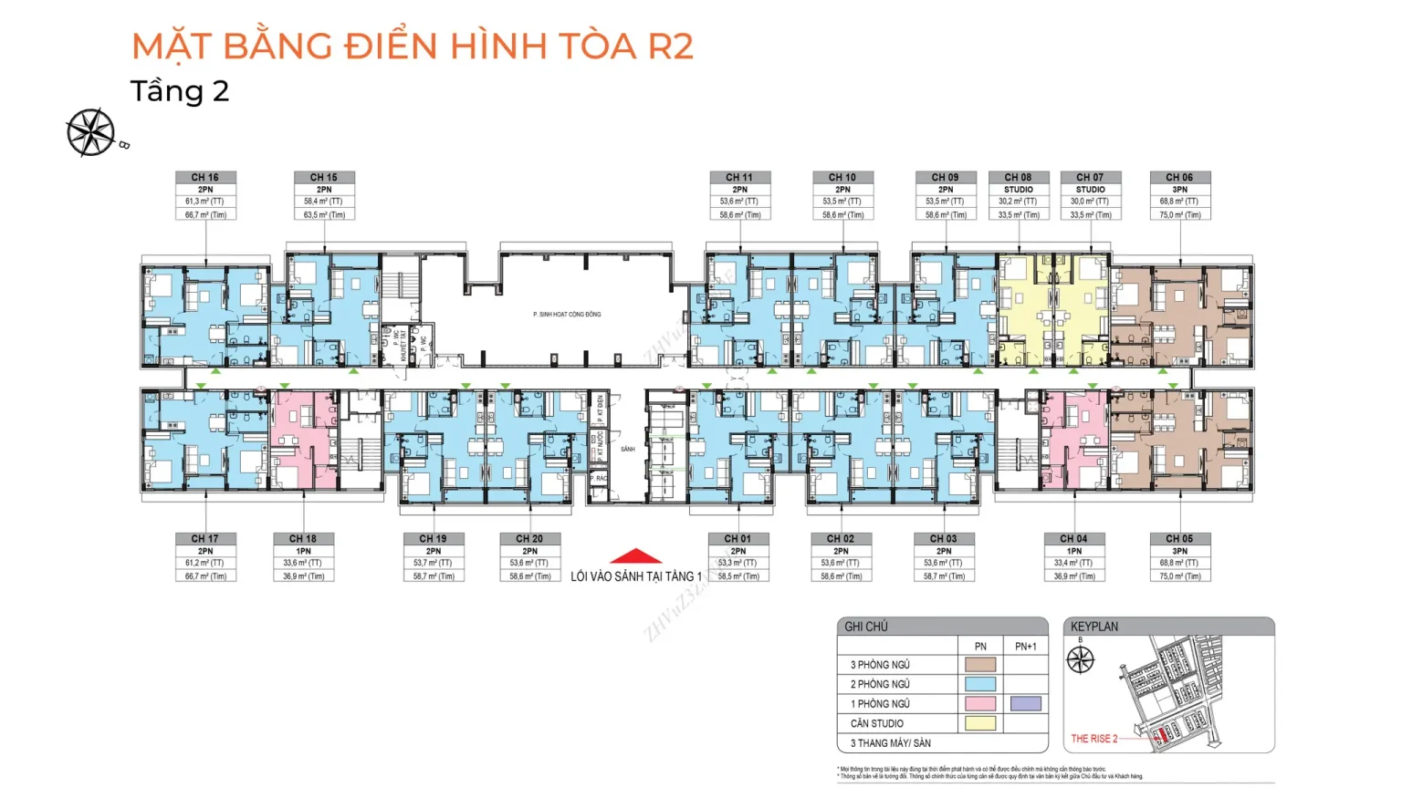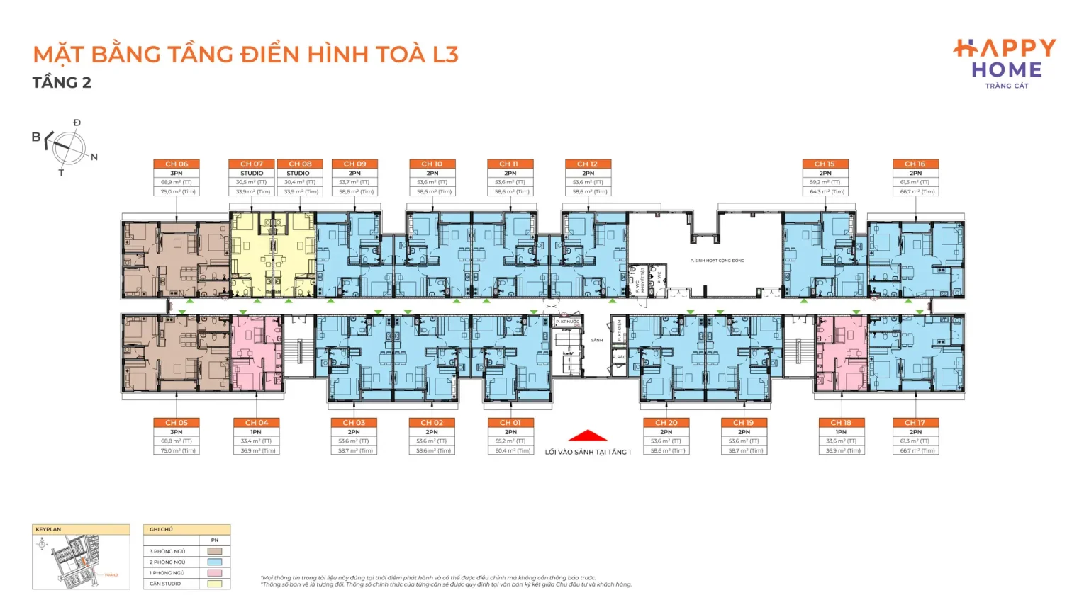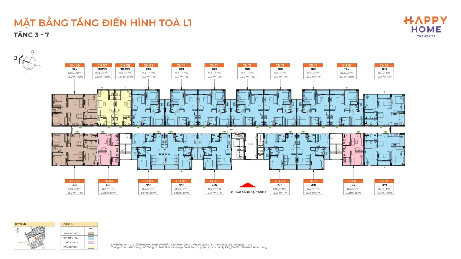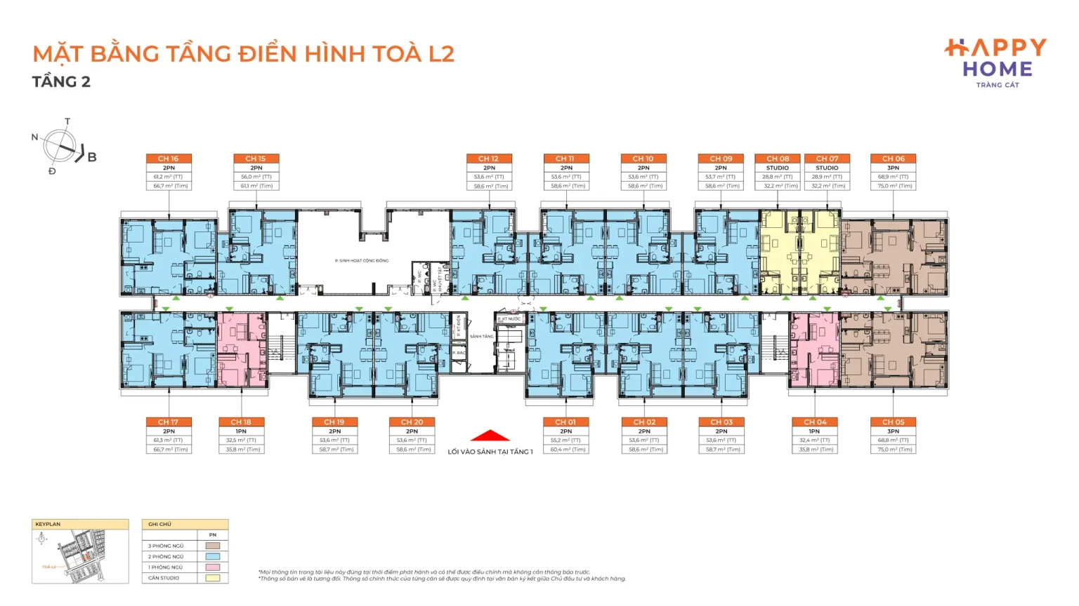 Sản phẩm tại các phân khu được thiết kế đa dạng diện tích từ 28m² đến 70m² (Studio, 1PN, 2PN, 3PN), đáp ứng đúng nhu cầu và khả năng tài chính của nhiều nhóm khách hàng khác nhau.