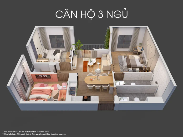 - LƯU Ý: NỘI THẤT CỦA CĂN MẪU CHỈ MANG TÍNH MINH HOẠ, CĂN HỘ KHI BÀN GIAO KHÔNG ĐI KÈM NỘI THẤT.